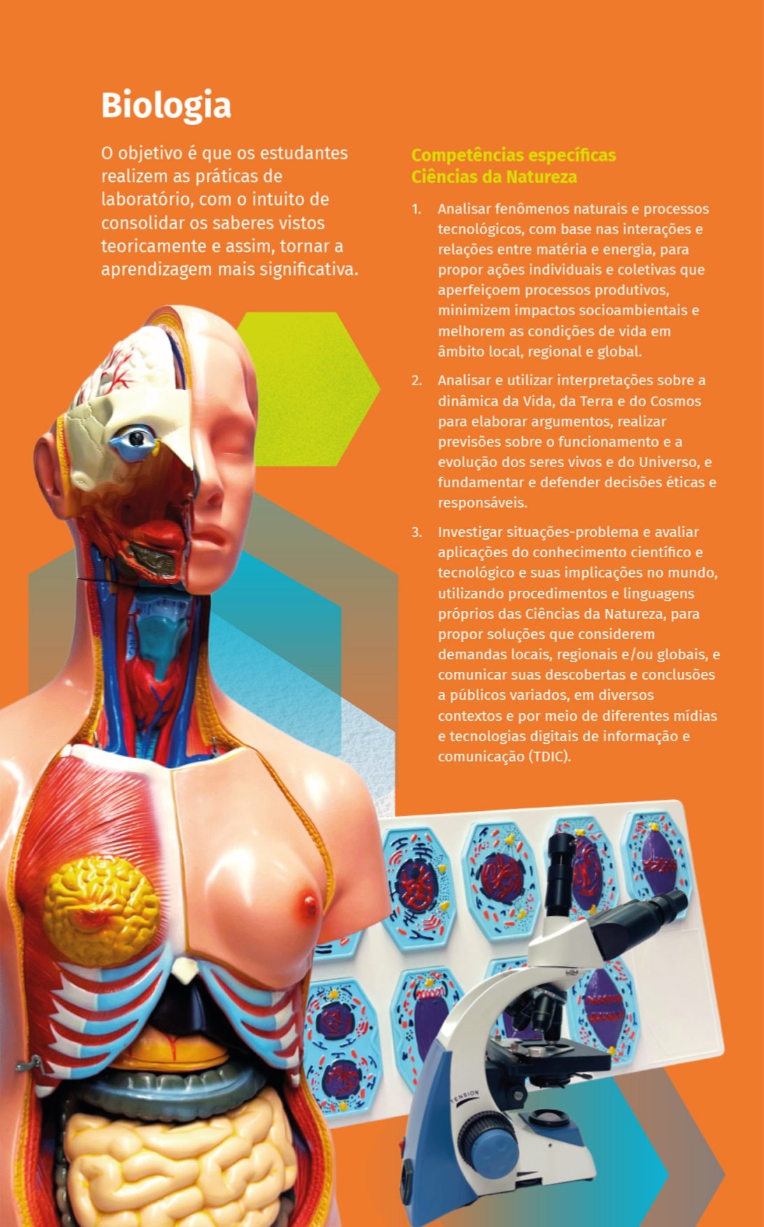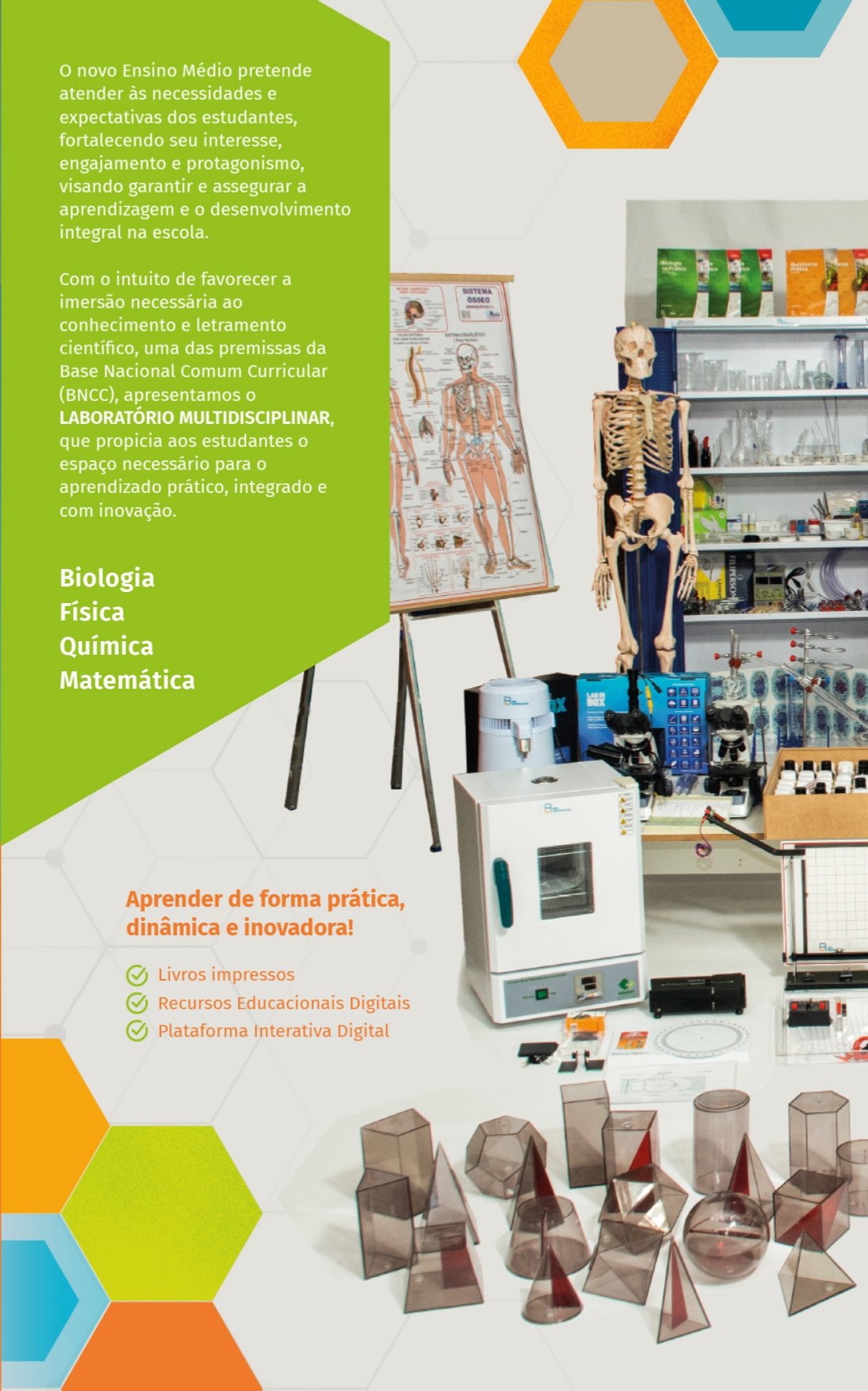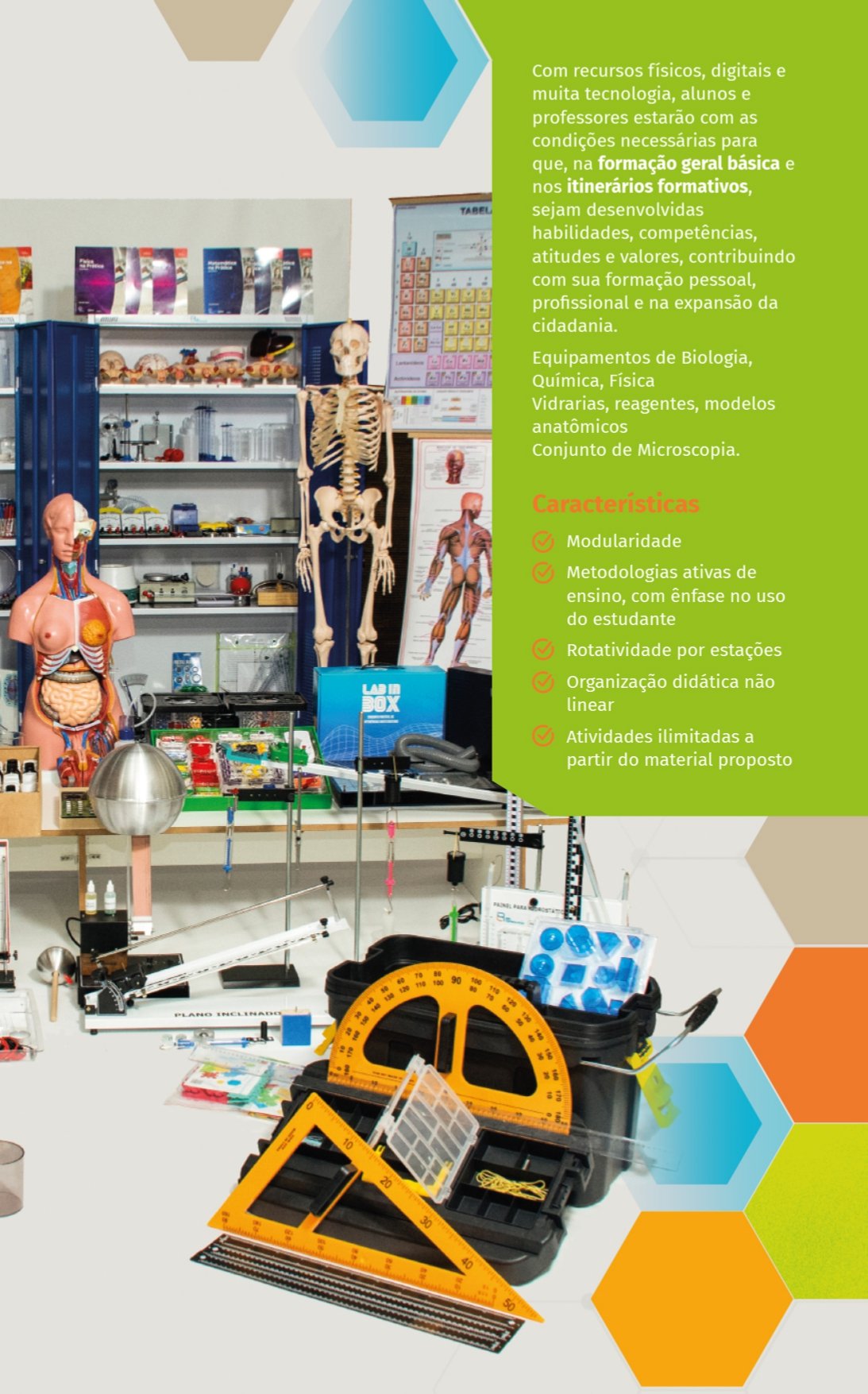 Com recursos físicos, digitais e muita tecnologia, alunos e professores estarão com as condições necessárias para que, na formação geral básica e nos itinerários formativos, sejam desenvolvidas habilidades, competências, atitudes e valores, contribuindo com sua formação pessoal, profissional e na expansão da cidadania.Equipamentos de Biologia, Química, Física